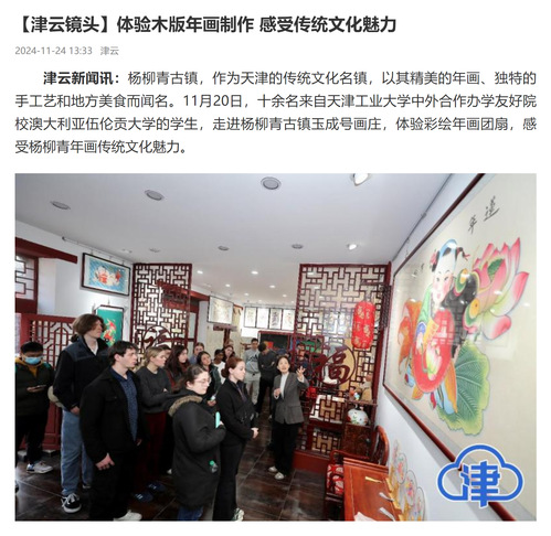 津云新闻讯:杨柳青古镇,作为天津的传统文化名镇,以其精美的年画、独特的手工艺和地方美食而闻名。11月20日,十余名来自天津工业大学中外合作办学友好院校澳大利亚伍伦贡大学的学生,走进杨柳青古镇玉成号画庄,体验彩绘年画团扇,感受杨柳青年画传统文化魅力。