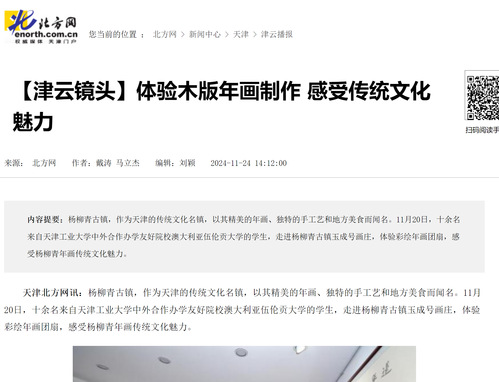 天津北方网讯:杨柳青古镇,作为天津的传统文化名镇,以其精美的年画、独特的手工艺和地方美食而闻名。11月20日,十余名来自天津工业大学中外合作办学友好院校澳大利亚伍伦贡大学的学生,走进杨柳青古镇玉成号画庄,体验彩绘年画团扇,感受杨柳青年画传统文化魅力。