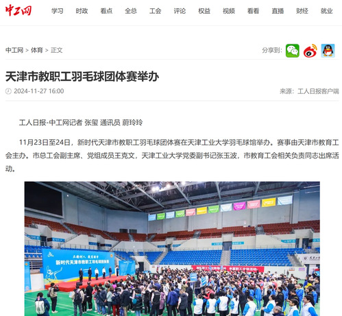 11月23日至24日,新时代天津市教职工羽毛球团体赛在天津工业大学羽毛球馆举办。赛事由天津市教育工会主办。市总工会副主席、党组成员王克文,天津工业大学党委副书记张玉波,市教育工会相关负责同志出席活动。