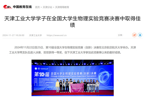 2024年11月22日至25日,第10届全国大学生物理实验竞赛(创新)决赛在北京航空航天大学举办。天津工业大学两支队伍进入决赛,双双获得一等奖,创下天津工业大学参加此项赛事以来的最好成绩。