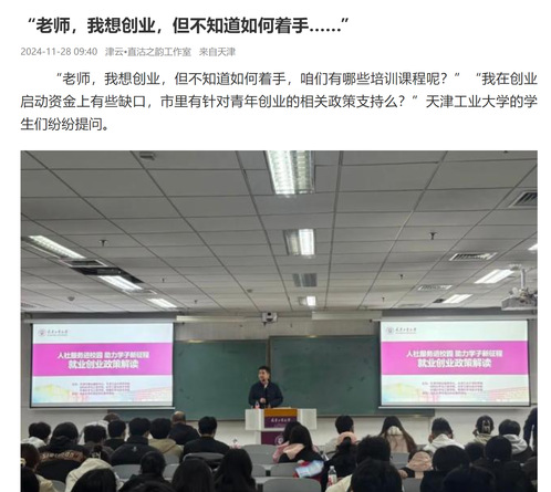 “老师,我想创业,但不知道如何着手,咱们有哪些培训课程呢?”“我在创业启动资金上有些缺口,市里有针对青年创业的相关政策支持么?”天津工业大学的学生们纷纷提问。