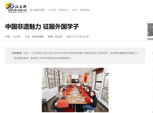 天津北方网讯:近日,十余名来自天津工业大学中外合作办学友好院校澳大利亚伍伦贡大学的学生,在西青区杨柳青古镇进行了一场非遗初体验,感受到了中华优秀传统文化的独特魅力。