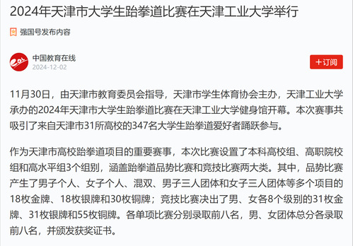 1130日,由天津市教育委员会指导,天津市学生体育协会主办,天津工业大学承办的2024年天津市大学生跆拳道比赛在天津工业大学健身馆开幕。本次赛事共吸引了来自天津市31所高校的347名大学生跆拳道爱好者踊跃参与。