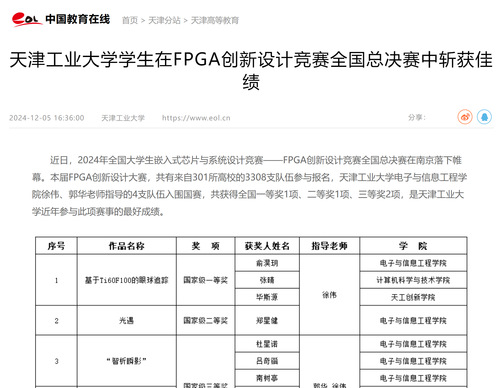 中国教育在线丨天津工业大学学生在FPGA创新设计竞赛全国总决赛中斩获佳绩