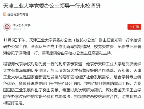 程碧海代表学校对谢光勇一行的到来表示欢迎,他表示天津工业大学与武汉纺织大学有着深厚的历史渊源,与武汉纺织大学有着良好的合作基础。近年来,天津工业大学立足国家创新驱动发展战略和区域经济社会发展需求,结合学科专业特色优势,多项科研成果应用于“神舟”系列飞船、“嫦娥”探月等国防重点工程,为我国国防工业发展作出了突出贡献。希望以此次调研为契机,深化借鉴天津工业学院在办学过程中的宝贵经验和成功做法,持续推进两校交流与合作,助推我校取得更好发展。
