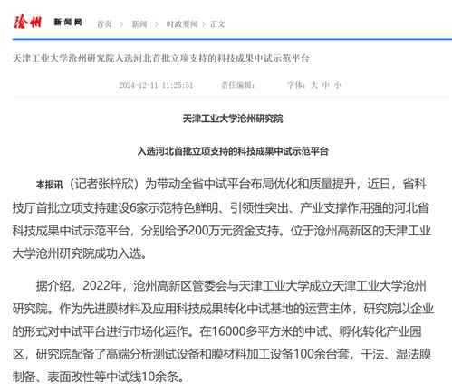 据介绍,2022年,沧州高新区管委会与天津工业大学成立天津工业大学沧州研究院。作为先进膜材料及应用科技成果转化中试基地的运营主体,研究院以企业的形式对中试平台进行市场化运作。在16000多平方米的中试、孵化转化产业园区,研究院配备了高端分析测试设备和膜材料加工设备100余台套,干法、湿法膜制备、表面改性等中试线10余条。