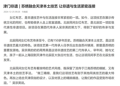 近一年来,只要没有特殊情况,每天早上,吴宗英都会做一个小时的网络直播,介绍作品的同时也展示技艺特色。今年7月,吴宗英参加了天津工业大学的非遗传承人高级研培班,在学习、参观、交流中,不仅提升了眼界还开阔了思路。这是她第三次参加天津工业大学的非遗研培班学习了。“每次学习都有收获,不仅有全国知名的非遗大师授课,还有来自全国各地的学员们互相交流学习。这些年,我把学到的京绣、宫廷绣、满绣和苗绣等技巧融入我的创作中,大大提高了创作水平。今年,我们还去了北京参观,开阔了眼界。特别是跟一些年轻的传承人交流之后,我意识到不能只是低头干活,还要抬头看路,跟上时代的发展。特别是在网络直播对传播非遗文化的重要性方面,我有了更深的认识。”