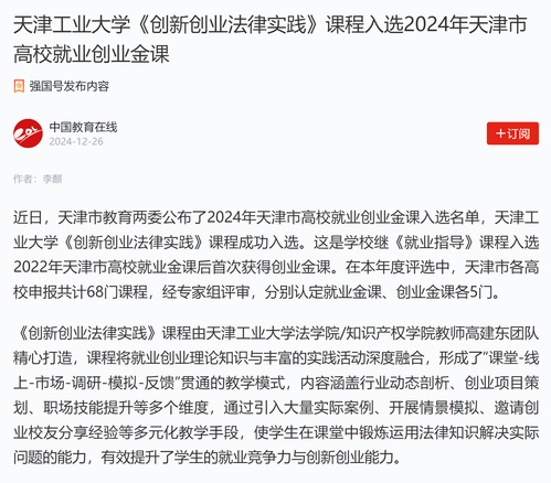 学习强国丨天津工业大学《创新创业法律实践》课程入选2024年天津市高校就业创业金课