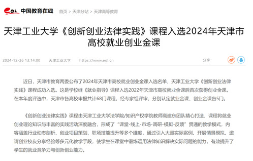 天津工业大学《创新创业法律实践》课程入选2024年天津市高校就业创业金课