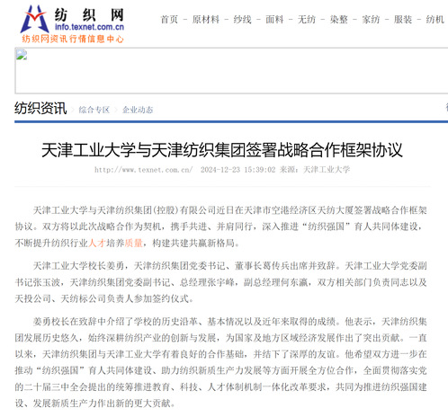 天津工业大学与天津纺织集团(控股)有限公司近日在天津市空港经济区天纺大厦签署战略合作框架协议。双方将以此次战略合作为契机,携手共进、并肩同行,深入推进“纺织强国”育人共同体建设,不断提升纺织行业人才培养质量,构建共建共赢新格局。