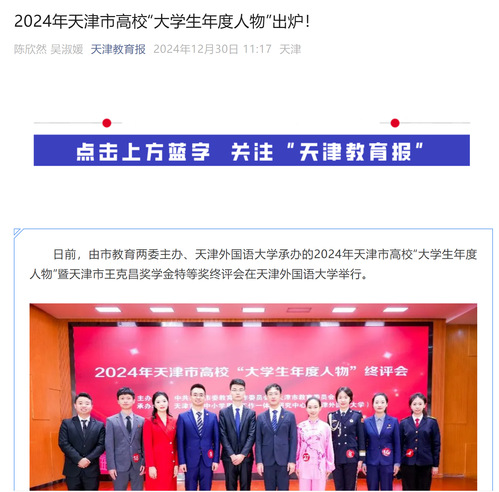 日前,由市教育两委主办、天津外国语大学承办的2024年天津市高校“大学生年度人物”暨天津市王克昌奖学金特等奖终评会在天津外国语大学举行。