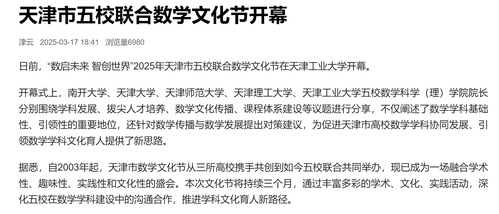 据悉,自2003年起,天津市数学文化节从三所高校携手共创到如今五校联合共同举办,现已成为一场融合学术性、趣味性、实践性和文化性的盛会。本次文化节将持续三个月,通过丰富多彩的学术、文化、实践活动,深化五校在数学学科建设中的沟通合作,推进学科文化育人新路径。