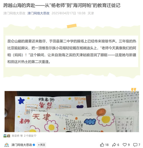 在于田第二中学“丝路文明对话”的课堂上,这位00后援疆支教老师总能把枯燥的理论化作生动的实践。当杨柳青年画的《连年有余》遇见桑皮纸上的《十二木卡姆》,当津门相声遇上刀郎麦西热甫,传统思政课变身为跨时空的文化交流。“原来天津的海河文化离我们这么近,我一定要去天津看看!”九年级的依不拉音在课堂上激动地说道。这个曾经羞于开口的男孩,如今能用较为流利的普通话讲述库尔班大叔“骑着毛驴上北京”的故事,推广国家通用语言和文字的意义在此刻具象化。