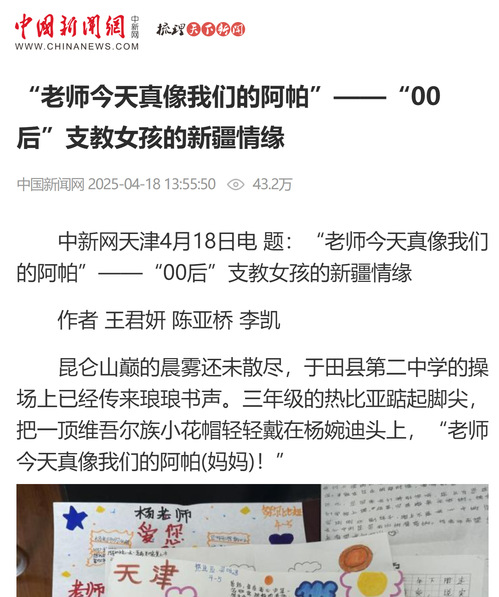 中新网天津4月18日电 题:“老师今天真像我们的阿帕”——“00后”支教女孩的新疆情缘