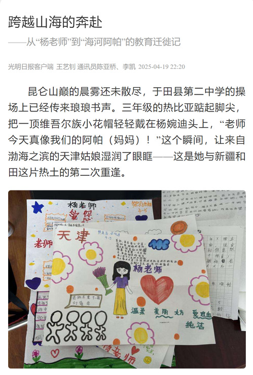 昆仑山巅的晨雾还未散尽,于田县第二中学的操场上已经传来琅琅书声。三年级的热比亚踮起脚尖,把一顶维吾尔族小花帽轻轻戴在杨婉迪头上,“老师今天真像我们的阿帕(妈妈)!”这个瞬间,让来自渤海之滨的天津姑娘湿润了眼眶——这是她与新疆和田这片热土的第二次重逢。