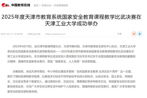 2025419日,由天津市教育两委主办,天津市教科院、天津市教育安全研究中心协办,天津工业大学承办的全民国家安全教育日宣传教育活动——2025年度天津市教育系统国家安全教育课程教学比武决赛在天津工业大学成功举办。本次课程教学比武旨在深入贯彻落实习近平总书记关于全面加强国家安全教育的重要指示精神,增强师生国家安全意识,营造“国家安全,人人有责”的浓厚氛围。