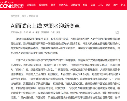天津工业大学纺织科学与工程学院2025届毕业生康嘉怡,刚刚经历了安踏体育用品集团有限公司的AI面试。回忆起这场面试,康嘉怡还处于兴奋中。“虽然学校提供过AI面试技巧培训,但真的面对‘机器人’时,还是紧张得手忙脚乱。”康嘉怡说,AI面试官是以身着职业装、大眼睛高鼻梁的卡通形象出现,声音是人工合成的,很机械化。AI面试官一共问了4个问题,每题有1分钟思考时间和5分钟作答时间。“思考时间和作答时间快结束时,会有倒计时,这时候紧张得手心都会冒汗。”时间比较紧凑,需要面试者尽快组织语言,捋清逻辑。和真人面试相比,康嘉怡觉得AI面试官还是有其优势,如能破除区域限制,缩短面试时间,比较方便。“我可以在电脑里选择自己喜欢的面试环境,相对能减少一些面试压力。AI面试官虽然没有什么语调,但避免了因面试官个人风格、爱好而影响面试结果。”最关键的是,AI面试后,系统生成的面试分析报告有助于让面试者注意到自己的问题,进行针对性的复盘调整,做到每一场面试都有收获、有成长。
