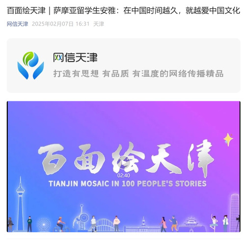 就读于天津工业大学国际教育学院的萨摩亚留学生安雅,正是被中国传统文化吸引而来。“这是我来天津的第5年,天津是个非常美丽又有活力的城市,天津人也非常热情活泼。在中国生活得越久,越能发现中国的魅力,我想成为萨摩亚和中国之间的文化桥梁,让更多萨摩亚人认识中国、了解中国。”安雅说。