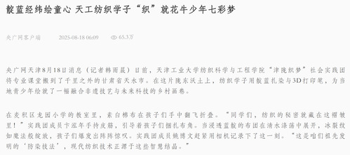 夕阳下,孩子们的扎染作品流淌着青蓝辉光,恰似传统与现代的深情对话。当纺织学子的田野科普遇见乡村少年的好奇目光,当千年非遗碰撞智能制造,乡村振兴的锦绣图景,正在这一针一线、一字一句的编织中渐次铺展。