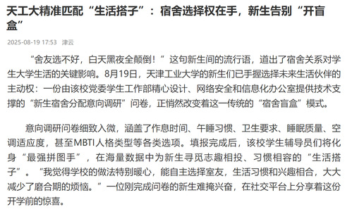意向调研问卷细致入微,涵盖了作息时间、午睡习惯、卫生要求、睡眠质量、空调适应度,甚至MBTI人格类型等各类选项。填报完成后,该校学生辅导员们将化身“最强拼图手”,在海量数据中为新生寻觅志趣相投、习惯相容的“生活搭子”。“我觉得学校的做法特别暖心,能自主选择室友,生活习惯和兴趣相合,大大减少了磨合期的烦恼。”一位刚完成问卷的新生难掩兴奋,在社交平台上分享着这份开学前的惊喜。