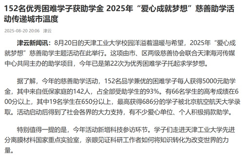 津云新闻讯:8月20日的天津工业大学校园洋溢着温暖与希望,2025年“爱心成就梦想”慈善助学主题活动在此举行。这项由市、区两级慈善协会联合天津海河传媒中心共同主办的助学项目,今年已是第22次为优秀困难学子托起求学梦想。
