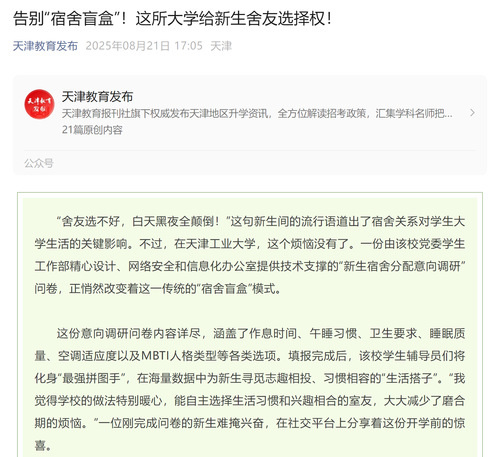 这份意向调研问卷内容详尽,涵盖了作息时间、午睡习惯、卫生要求、睡眠质量、空调适应度以及MBTI人格类型等各类选项。填报完成后,该校学生辅导员们将化身“最强拼图手”,在海量数据中为新生寻觅志趣相投、习惯相容的“生活搭子”。“我觉得学校的做法特别暖心,能自主选择生活习惯和兴趣相合的室友,大大减少了磨合期的烦恼。”一位刚完成问卷的新生难掩兴奋,在社交平台上分享着这份开学前的惊喜。