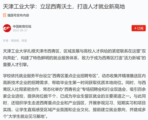 天津工业大学扎根天津市西青区,区域发展与高校人才供给的紧密联系在这里“双向奔赴”,构建了特色鲜明的就业服务体系,致力于成为西青区打造“活力新城”的重要人才引擎。