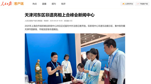 2025年上海合作组织峰会新闻中心28日正式面向中外注册记者开放。在新闻中心非遗互动展示区,集中陈列着天津市国家级、市级及区级非遗展品。