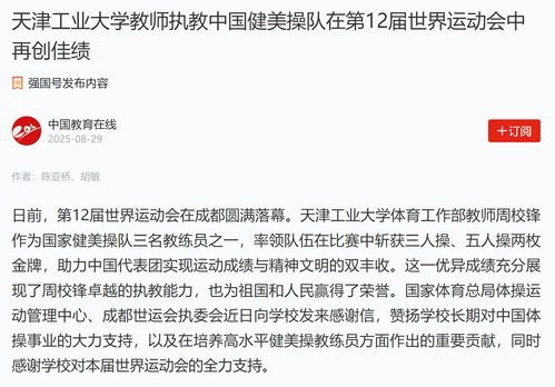 周校锋是中国健美操从崛起到巅峰的亲历者、贡献者和引领者,他的成长轨迹,也是学校践行“体教融合”育人理念的突出典范。此次世界运动会上取得的成绩,充分体现了天津工业大学在高水平体育人才培养方面的深厚积淀与卓越贡献,也为体育强国、健康中国建设贡献了天工力量。