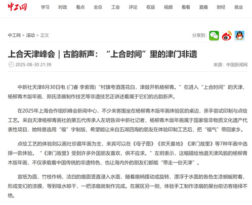 中新社天津8月30日电 (门睿 李紫薇)“村旗夸酒莲花白,津鼓开帆杨柳青。”在进入“上合时间”的天津,杨柳青木版年画、郑氏漆器制作技艺等非遗技艺正讲述着属于它们的古韵新声。