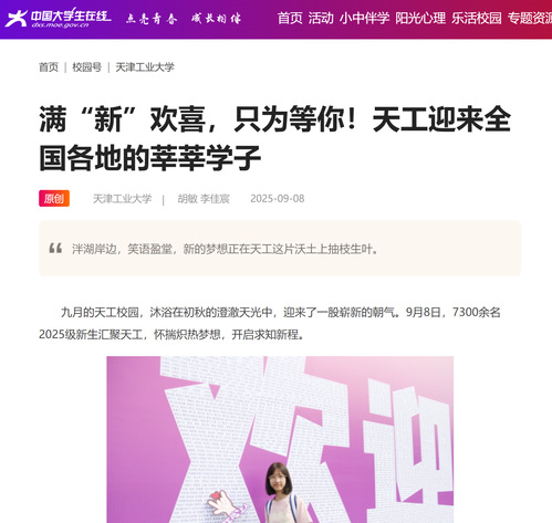 九月的天工校园,沐浴在初秋的澄澈天光中,迎来了一股崭新的朝气。9月8日,7300余名2025级新生汇聚天工,怀揣炽热梦想,开启求知新程。