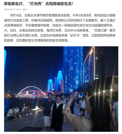 9月16日,记者从天津市城市管理委员会获悉,今年3月至8月,我市启动大规模城市灯光改造工程,对海河沿线建筑、桥梁和公共空间进行了全面提升。数十万盏灯点亮津城夜空,不仅重塑城市夜景,也成为一张融合现代活力与文化底蕴的城市名片。近日,记者实地探访发现,海河灯光秀、文化中心光影表演、“天津之眼”摩天轮灯光秀以及天塔灯光秀,已成为外地游客来津“必打卡”项目,尤其受到年轻群体的追捧,正在重新定义京津冀地区的夜生活格局。
