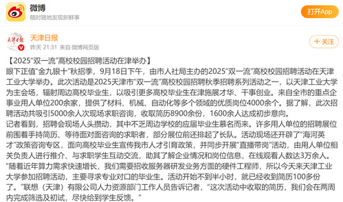 “今年下半年,我们安排了7场‘双一流’高校专场招聘活动,近期还将赴北京和西北地区举办活动,并将在10月、11月密集举办10至15场市属高校校园招聘活动,还同步配套了包括校友推介会、天津籍学子交流座谈会、搭建云聘会专区等多层次、立体化的活动体系,通过这一系列‘组合拳’,为我市用人单位和高校毕业生搭建精准对接平台,帮助企业破解用人难题,为高校毕业生提供高质量、多元化的择业机会。”市人社局人才开发处处长朱虹表示。(记者 姜凝)