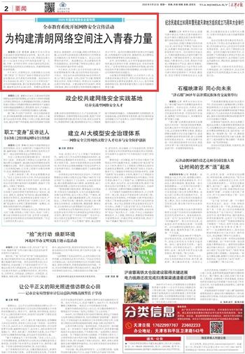 从政策宣传到情景模拟,从大学到中小学,全市教育系统通过多层次、多形式的系列活动,切实推动网络安全教育走进课堂、深入人心,也为构建清朗网络空间、服务高质量发展注入坚实而温暖的青春力量。