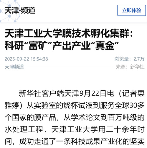 新华社客户端天津9月22日电(记者栗雅婷)从实验室的烧杯试液到服务全球30多个国家的膜产品,从学术论文到百万吨级的水处理工程,天津工业大学用二十余年时间,成功走通了一条科技成果产业化的坚实道路。