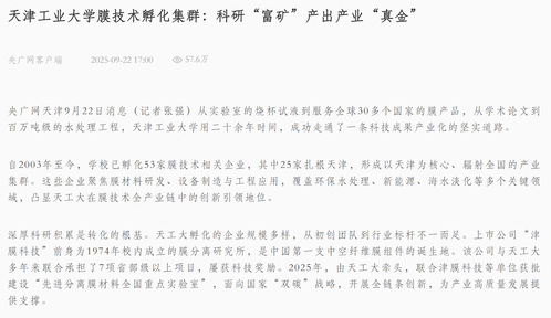 自2003年至今,学校已孵化53家膜技术相关企业,其中25家扎根天津,形成以天津为核心、辐射全国的产业集群。这些企业聚焦膜材料研发、设备制造与工程应用,覆盖环保水处理、新能源、海水淡化等多个关键领域,凸显天工大在膜技术全产业链中的创新引领地位。