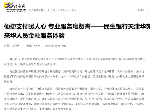 便捷支付暖人心 专业服务赢赞誉——民生银行天津华苑支行持续优化外籍来华人员金融服务体验