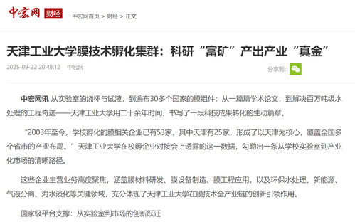 未来,依托先进分离膜材料全国重点实验室的科研支撑,天津工业大学将继续深化与政府、产业的合作,推动更多膜技术成果转化落地。这支从高校走出的创新力量,正在用实实在在的创新成果,书写着科技成果转化的“天工答卷”。(中宏网特约作者王敏报道 文章/天津工业大学刘孜勤 陈亚桥)