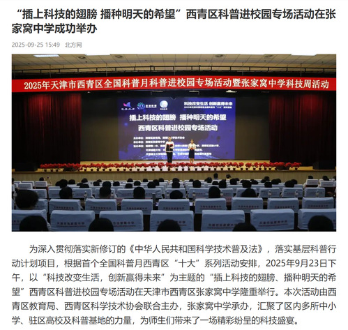 为深入贯彻落实新修订的《中华人民共和国科学技术普及法》,落实基层科普行动计划项目,根据首个全国科普月西青区“十大”系列活动安排,2025年9月23日下午,以“科技改变生活,创新赢得未来”为主题的“插上科技的翅膀、播种明天的希望”西青区科普进校园专场活动在天津市西青区张家窝中学隆重举行。本次活动由西青区教育局、西青区科学技术协会联合主办,张家窝中学承办,汇聚了区内多所中小学、驻区高校及科普基地的力量,为师生们带来了一场精彩纷呈的科技盛宴。