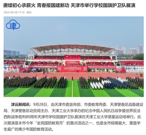 津云新闻讯:9月28日,由天津市委宣传部、市委教育两委、天津警备区战备建设局、天津警备区动员局主办,天津工业大学承办的纪念中国人民抗日战争暨世界反法西斯战争胜利80周年天津市学校国旗护卫队展演在天津工业大学望星运动场举行。此次展演是本市今年“全民国防教育月”的重点活动之一,也是全市规模最大、覆盖学生最广的青少年国防教育活动。