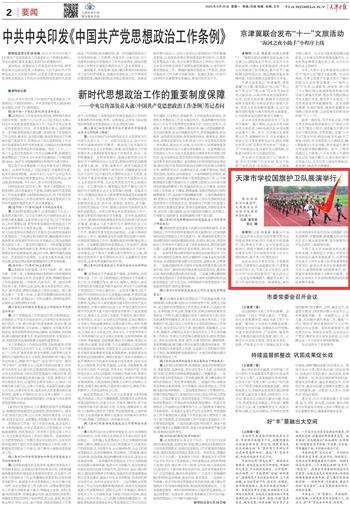 天津工业大学2025级本科生展示的刺杀操、天津财经大学珠江学院学生带来的综合战术及旗语展示、天津市南开区东方小学学生展示的军体拳等特色军事项目,彰显出我市学生的蓬勃朝气与活力,赢得现场观众的阵阵掌声,是一堂富有成效的爱国主义教育实践课。展演在全场师生齐声高唱《歌唱祖国》的激昂旋律中落幕。