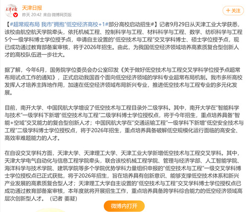 【#超常规布局 我市“拥抱”低空经济高校+1#部分高校启动招生#】记者9月29日从天津工业大学获悉,该校由航空航天学院牵头,依托机械工程、控制科学与工程、材料科学与工程、数学、纺织科学与工程5个一级学科博士学位授予点,申请自主设置的“低空技术与工程”交叉学科博士、硕士学位授予点,现已成功通过教育部备案审核,将于2026年招生。由此,为我国低空经济领域培养高素质复合型创新人才的高校队伍进一步壮大。