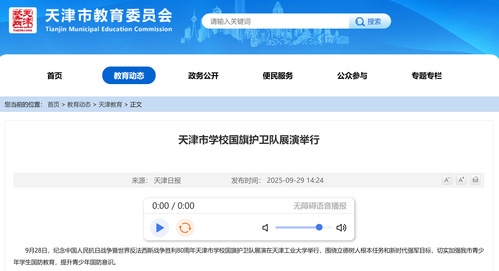 9月28日,纪念中国人民抗日战争暨世界反法西斯战争胜利80周年天津市学校国旗护卫队展演在天津工业大学举行,围绕立德树人根本任务和新时代强军目标,切实加强我市青少年学生国防教育,提升青少年国防意识。
