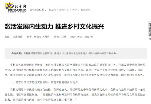 乡村振兴既要塑形也要铸魂,推进乡村文化振兴是全面推进乡村振兴战略的重要目标任务。传承发展中华优秀传统文化,通过创造性转化和创新性发展不断激发传统文化的内在活力,调动广大农民干事创业的积极性、主动性、创造性,推动文化事业全面繁荣和文化产业快速发展,可为深入推进乡村文化振兴提供强大动力源泉,助力乡村全面振兴。