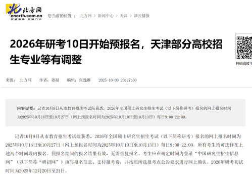 2026年研考10日开始预报名,天津部分高校招生专业等有调整