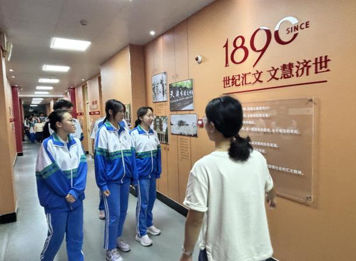 高中学段选取汇文中学文化墙和校史长廊作为实践教学点位开展现场教学,从汇文中学的文化精神和传承入手,引导学生领会“文化惠民”的深刻内涵,自觉将对自强精神的传承,转化为积极参与文化惠民的实际行动。