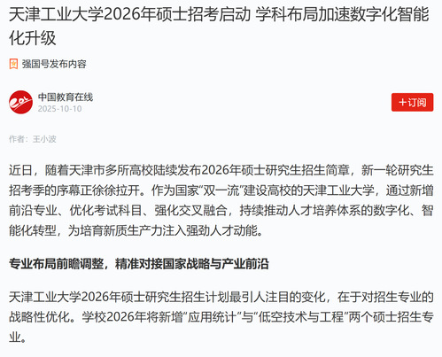 学习强国丨天津工业大学2026年硕士招考启动 学科布局加速数字化智能化升级