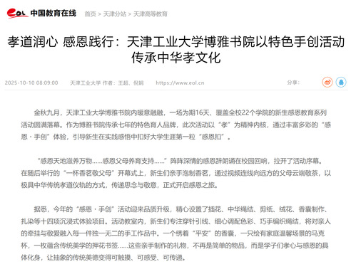 此次感恩教育系列活动是天津工业大学落实立德树人根本任务的生动实践。未来,博雅书院将继续深化活动内涵,让历史悠久的孝道文化在新时代校园焕发更强生命力,为培养德智体美劳全面发展、兼具传统美德与时代精神的新时代青年贡献力量,为高校思想政治教育与文化传承的有机融合提供有益借鉴。