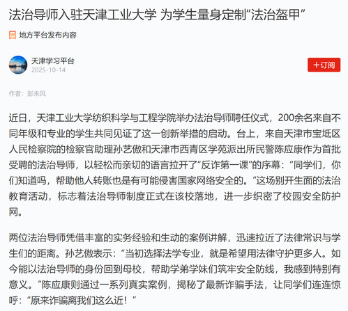 近日,天津工业大学纺织科学与工程学院举办法治导师聘任仪式,200余名来自不同年级和专业的学生共同见证了这一创新举措的启动。台上,来自天津市宝坻区人民检察院的检察官助理孙艺傲和天津市西青区学苑派出所民警陈应康作为首批受聘的法治导师,以轻松而亲切的语言拉开了“反诈第一课”的序幕:“同学们,你们知道吗,帮助他人转账也是有可能侵害国家网络安全的。”这场别开生面的法治教育活动,标志着法治导师制度正式在该校落地,进一步织密了校园安全防护网。