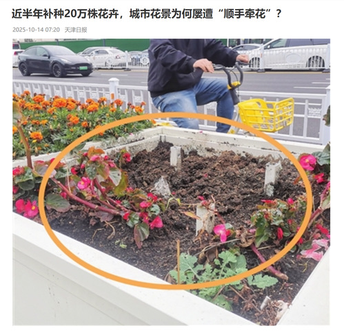 为应对“丢花”问题,城市管理部门被迫投入大量额外成本,建立起“巡查—上报—补种”的应急机制。据介绍,园林部门每天派出4组巡查人员分片巡检,并配备10辆厢式货车和50名施工人员,主要在夜间进行补种,确保次日景观完整。“夜间补种”已成为园林工人的日常工作。